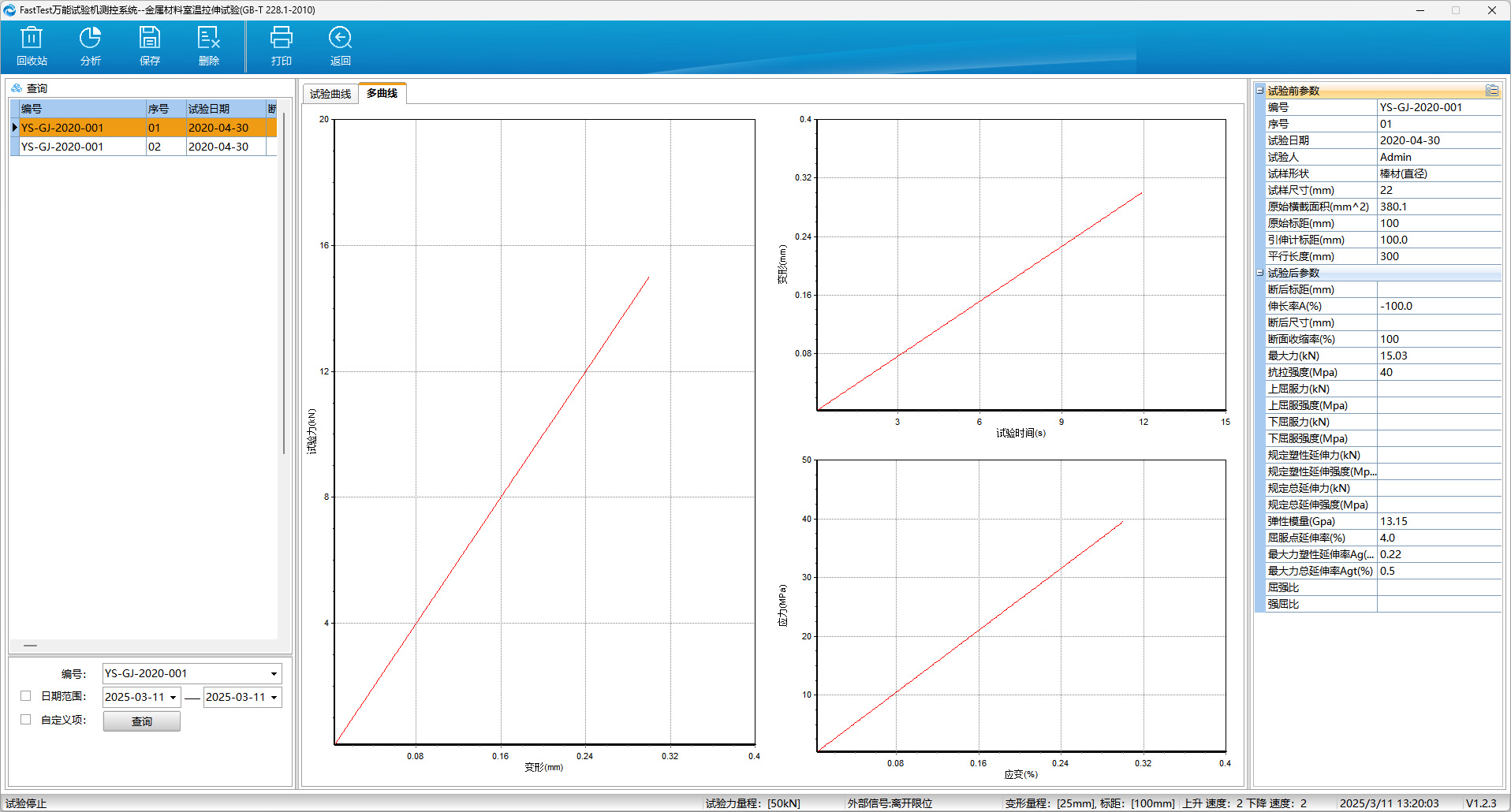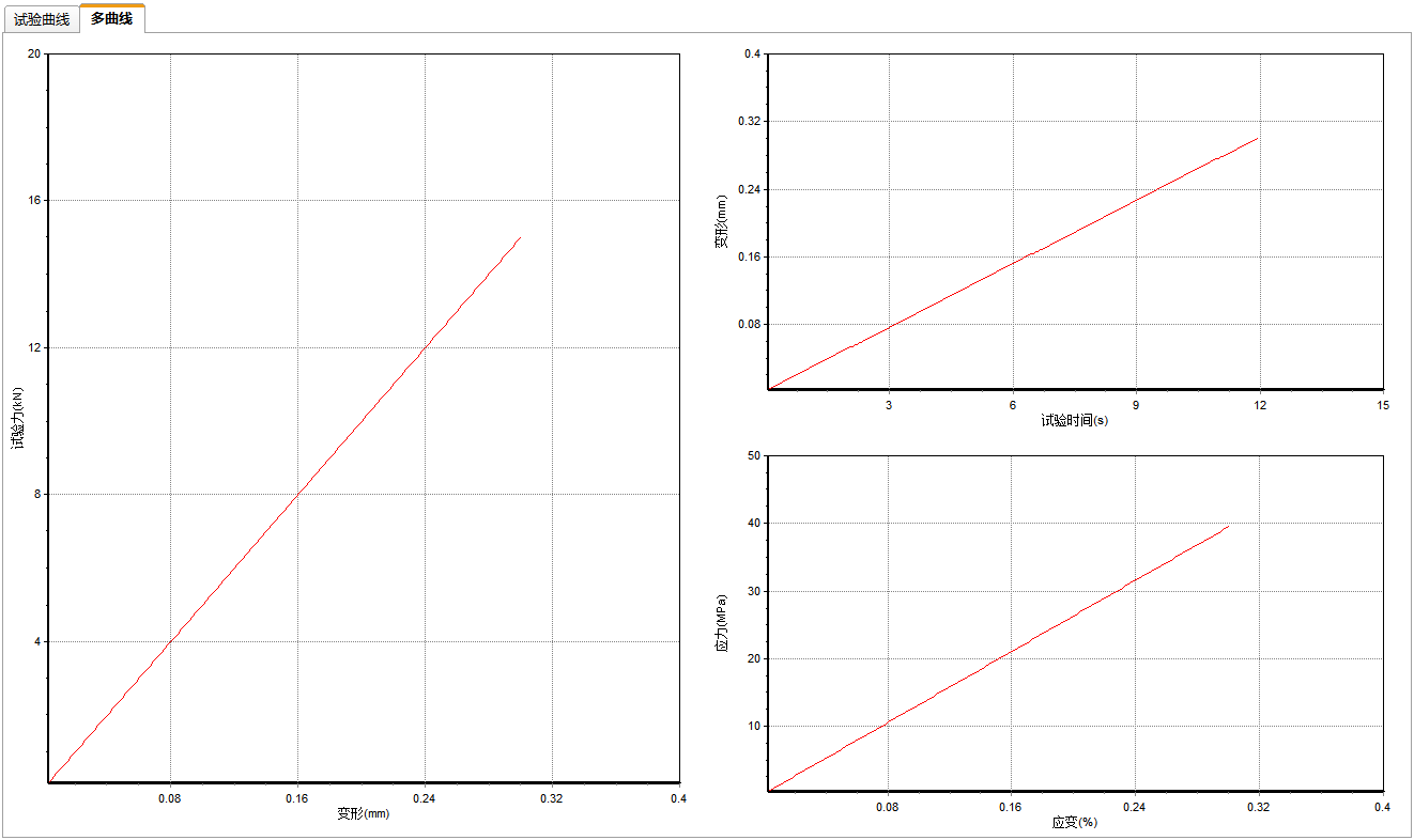 具有曲线多轴显示功能,如:载荷-变形、应力-应变、应力-时间、应变-时间等。多条曲线可以不同颜色在同-坐标中叠加或分离显示。强大的曲线分析功能,在试验曲线上可显示和标注各特征点,并且可以在曲线上自动或手动取点进行对比分析,标注了特征点的曲线还可以在试验报告中打印输出。