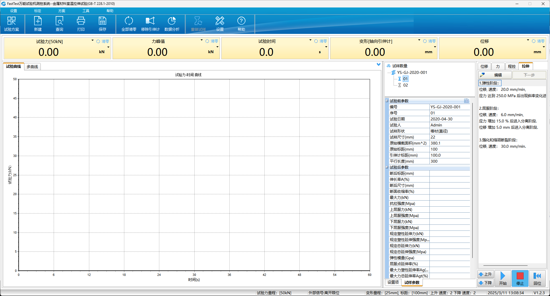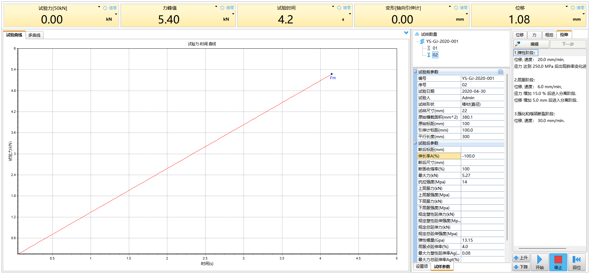 拥有强大的试验管理功能,参数单位可根据需求任意设定。可根据不同的标准编辑相应的试验方案,试验时只要选择试验方案,即可根据标准要求完成试验,并输出满足标准要求的试验报告。试验过程及设备状态实时显示,如:设备运行状态、程序控制运行步骤、引伸计是否切换完成等,提醒操作员设备当前的报警信息和屈服结束后取下引伸计。