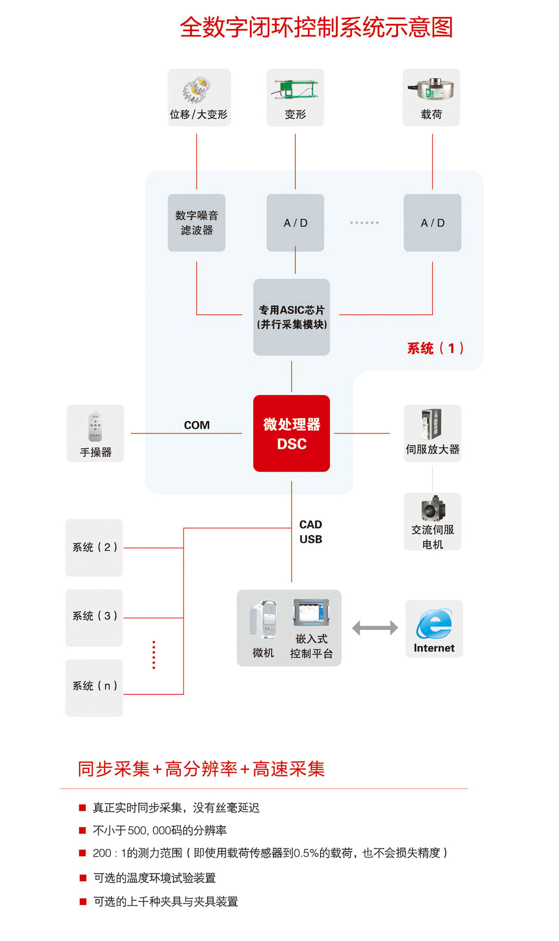 l DSP+MCU的优化组合,即有DSP的快速运算,同时集成了MCU对I/O控制能力的优点,其整体性能明显优于单纯的DSP或32位单片机。 l 正真实现了以硬件为基础的并行采样模式,具有强大的数据采集、分析功能 l 三闭环(应力、应变、位移)控制功能底层实现,试验过程中各种控制方式可无冲击自动切换,可进行较复杂的编程试验。