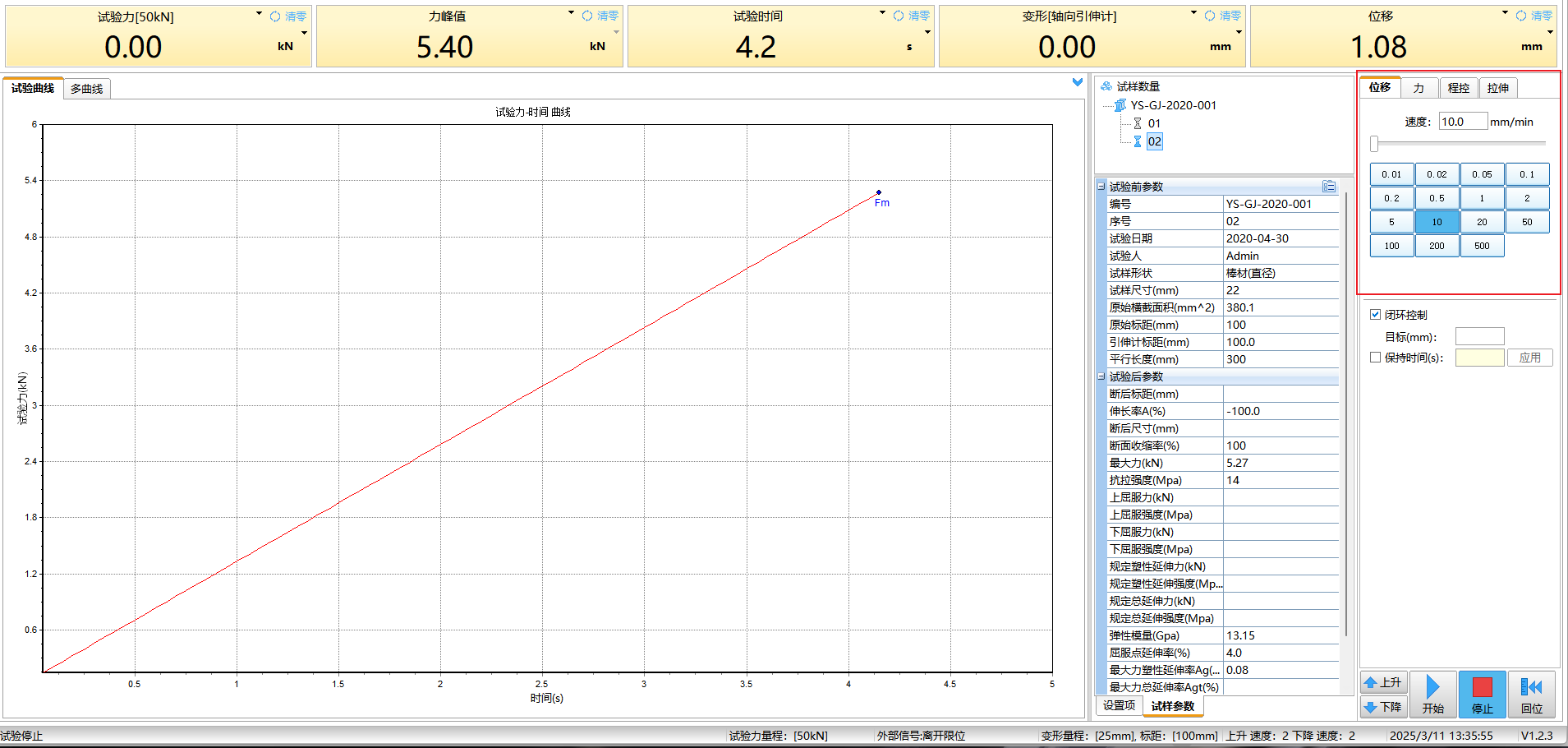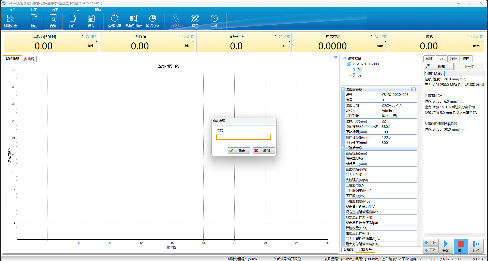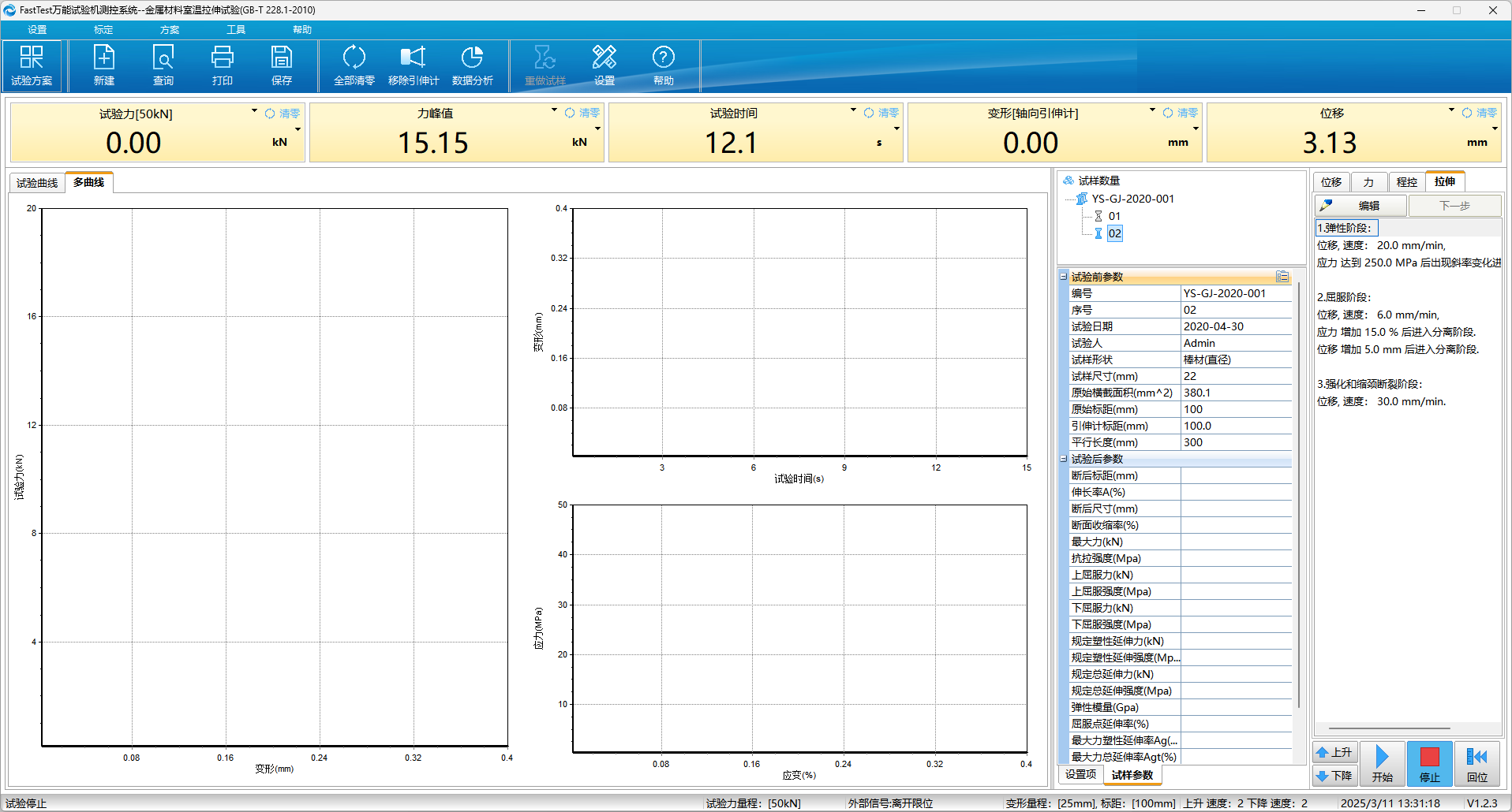 试验管理功能 拥有强大的试验管理功能,参数单位可根据需求任意设定。可根据不同的标准编辑相应的试验方案,试验时只要选择试验方案,即可根据标准要求完成试验,并输出满足标准要求的试验报告。试验过程及设备状态实时显示,如:设备运行状态、程序控制运行步骤、引伸计是否切换完成等,提醒操作员设备当前的报警信息和屈服结束后取下引伸计。