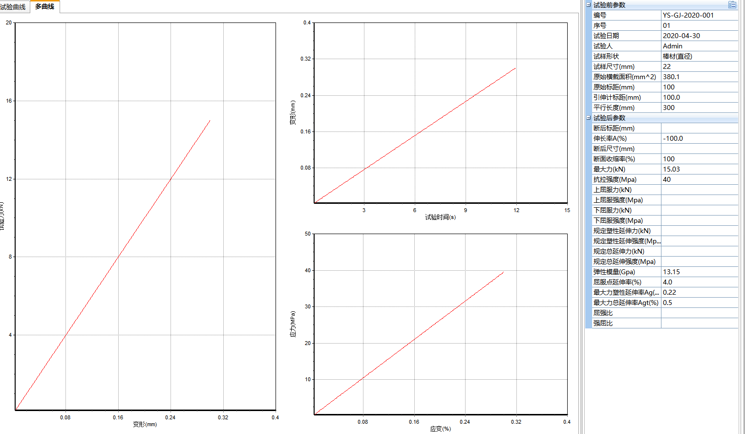 曲线多轴显示功能 具有曲线多轴显示功能,如:载荷-变形、应力-应变、应力-时间、应变-时间等。多条曲线可以不同颜色在同-坐标中叠加或分离显示。强大的曲线分析功能,在试验曲线上可显示和标注各特征点,并且可以在曲线上自动或手动取点进行对比分析,标注了特征点的曲线还可以在试验报告中打印输出。